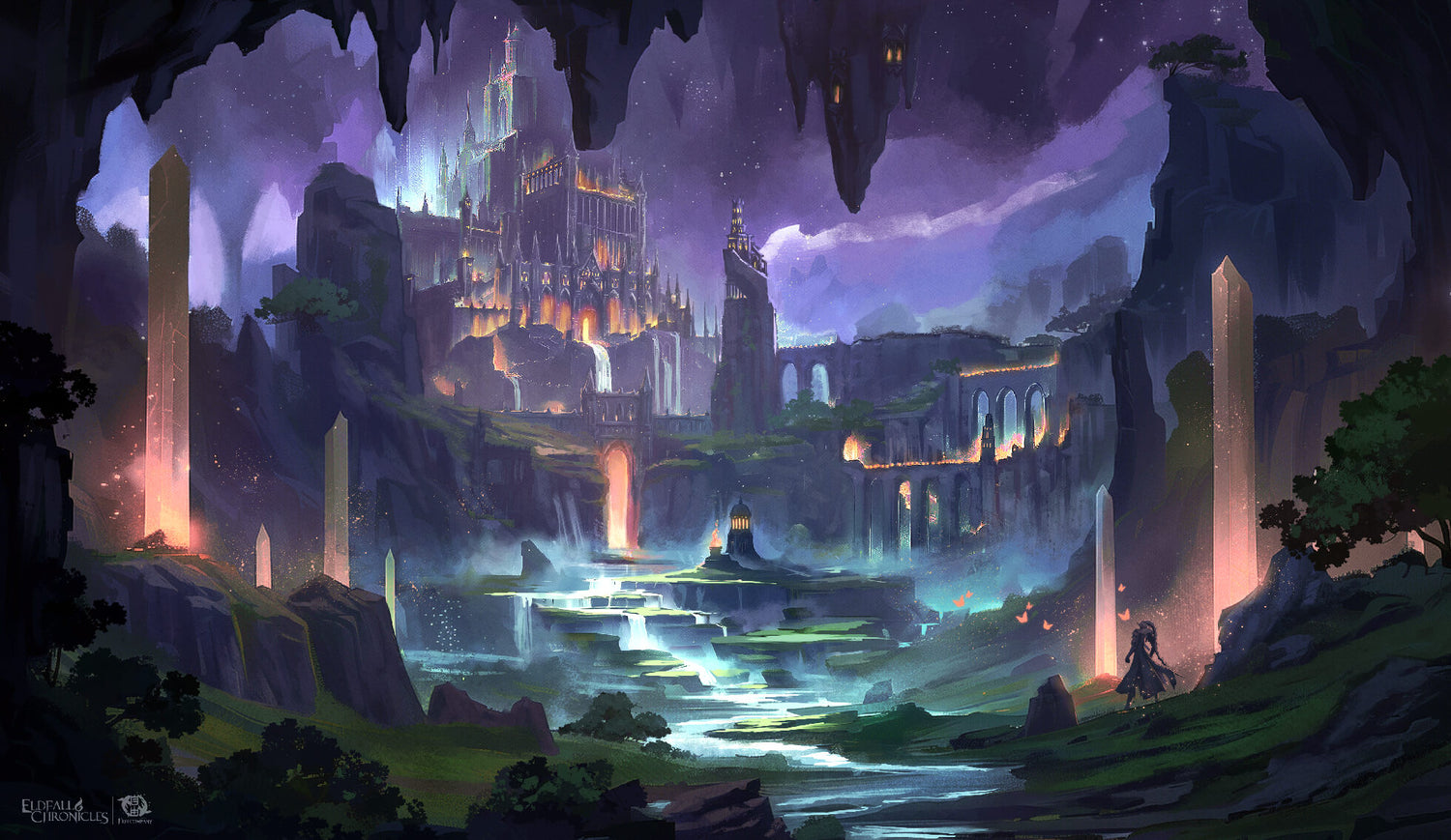 Hair colors include white, ash-blonde, silver, moss green, or the deep black of shadowed stone.